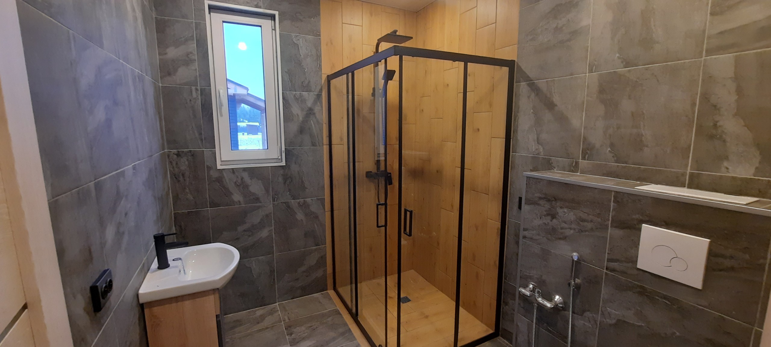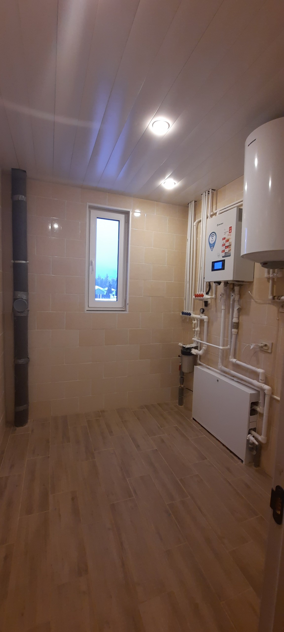 Теплый пол – водяной с антифризом. Электрокотел. На полу уложен качественный керамогранит , ламинат , 2 сан. узла. В сан. узлах установлено все необходимое оборудование. Установлен бойлер. Септик. Декоративный потолок.