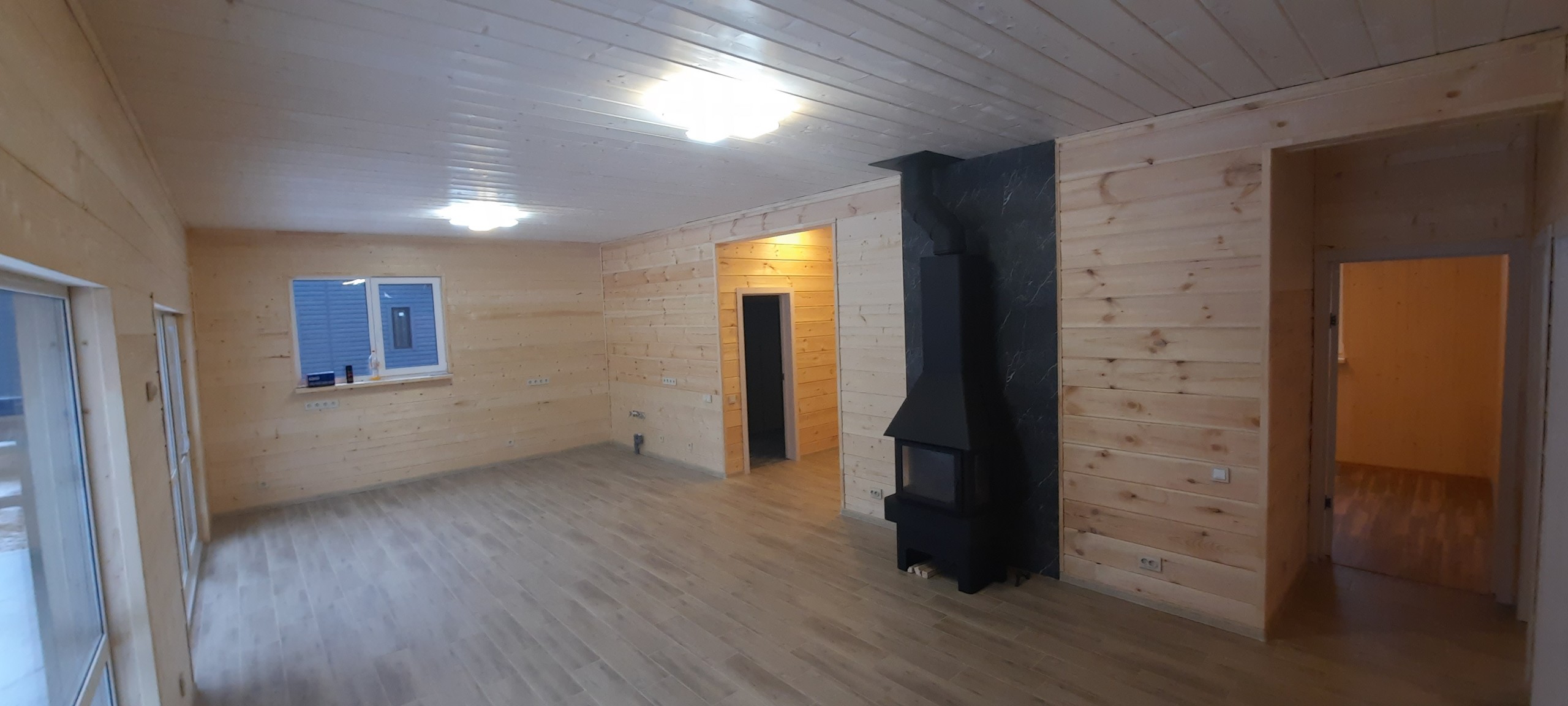 Стены – утепление белотермом 20 мм и утеплитель 150мм,стены , потолок внутри помещения — имитация бруса , вагонка .