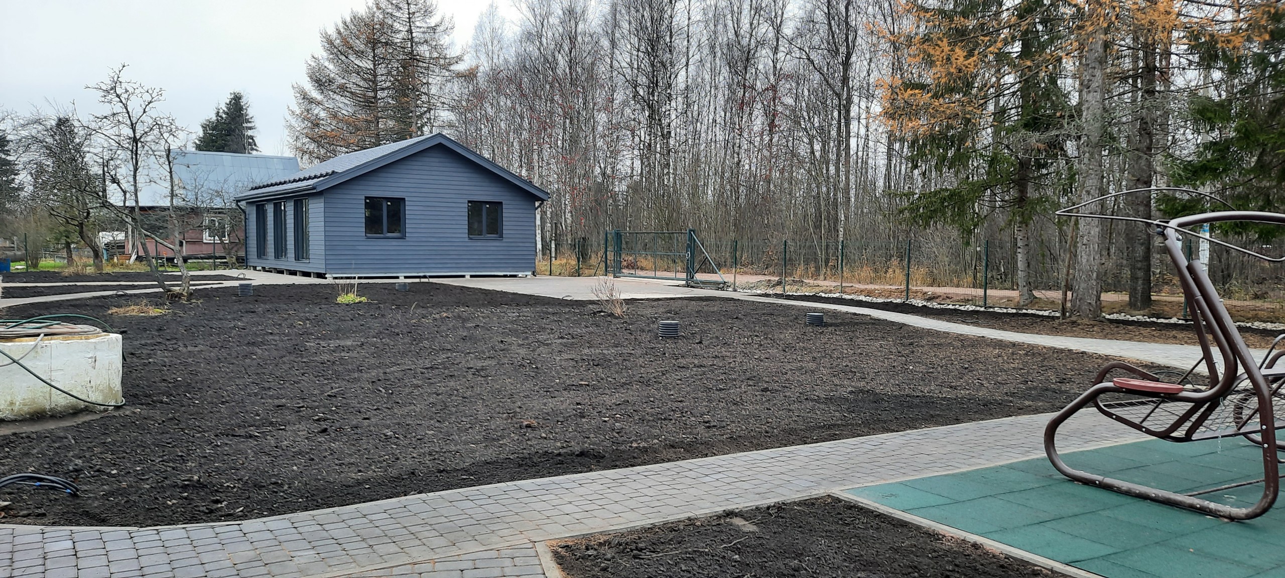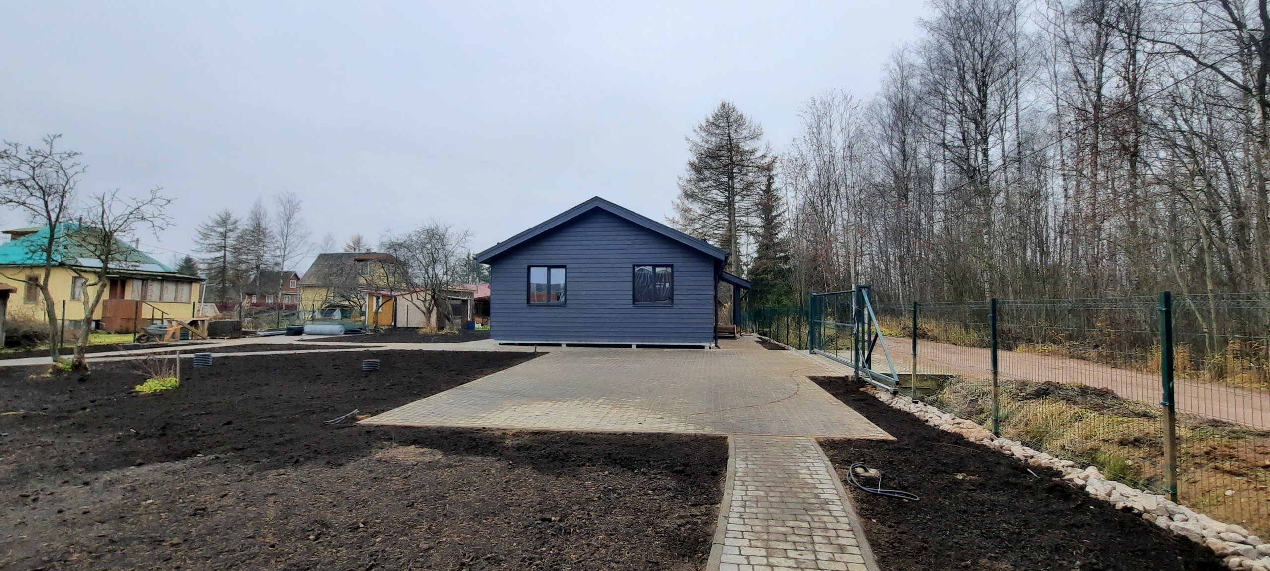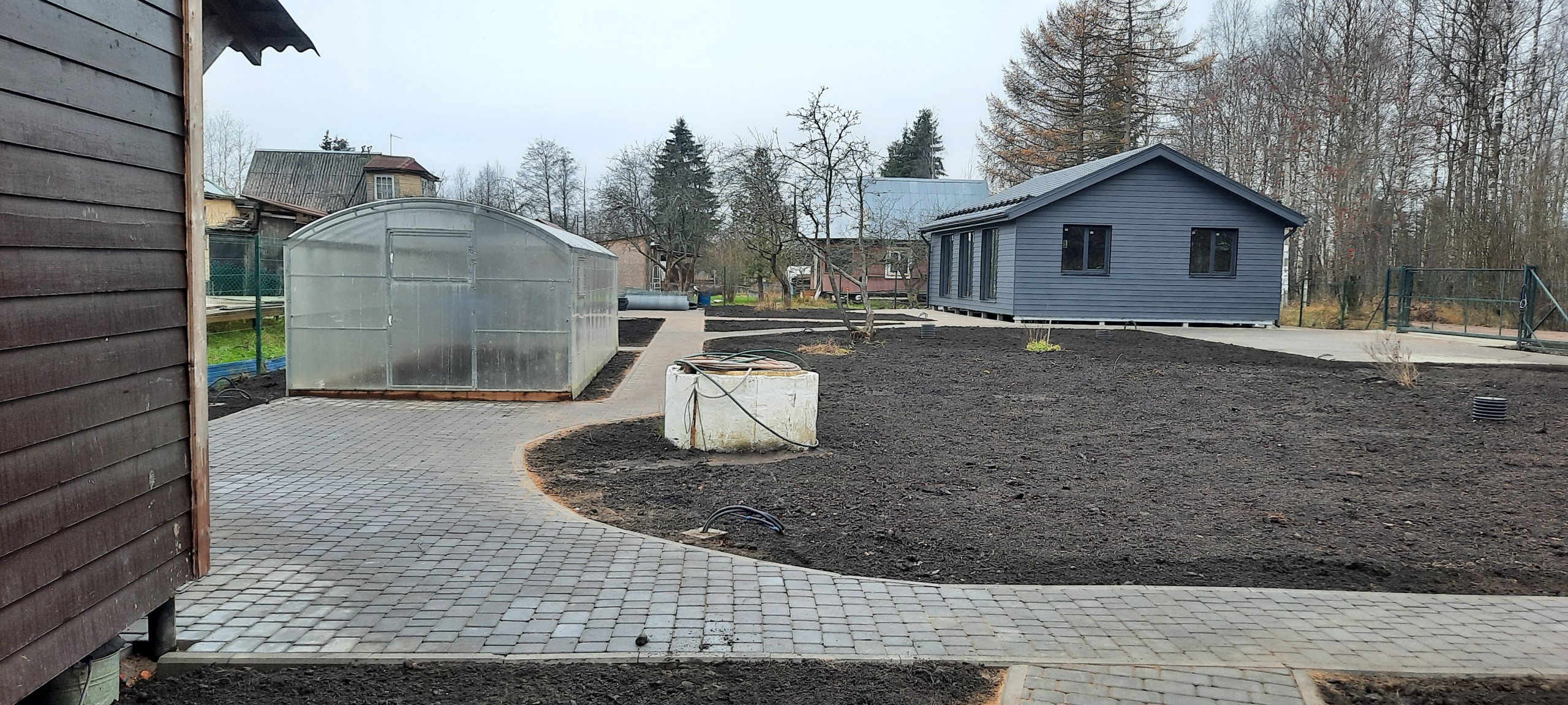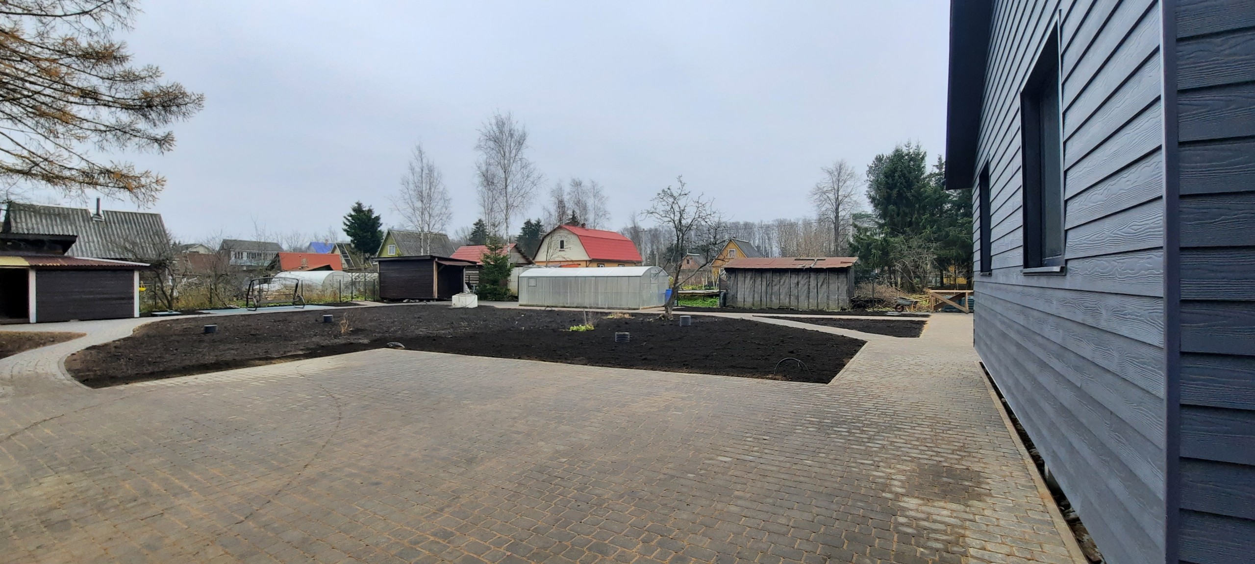 Полностью сделано благоустройство участка, газоны, мощение тротуарной плиткой.