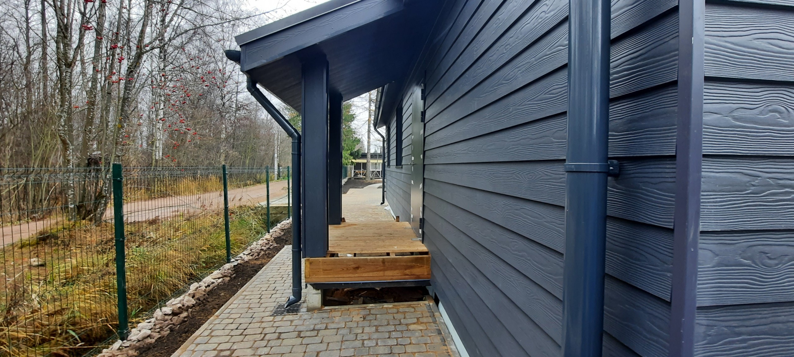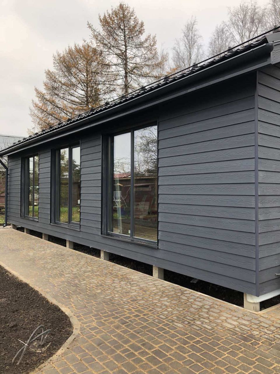 Фасад выполнен в современном стиле ( кедрал ) цоколь имитация искусственного камня. Большие панорамные окна