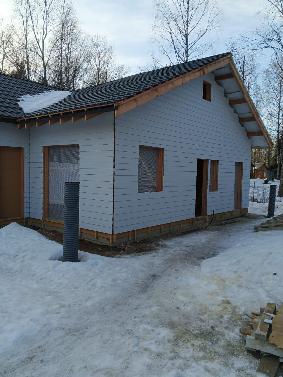 Фасад выполнен в современном стиле ( фибросайдинг ) цоколь имитация искусственного камня. Большие панорамные окна